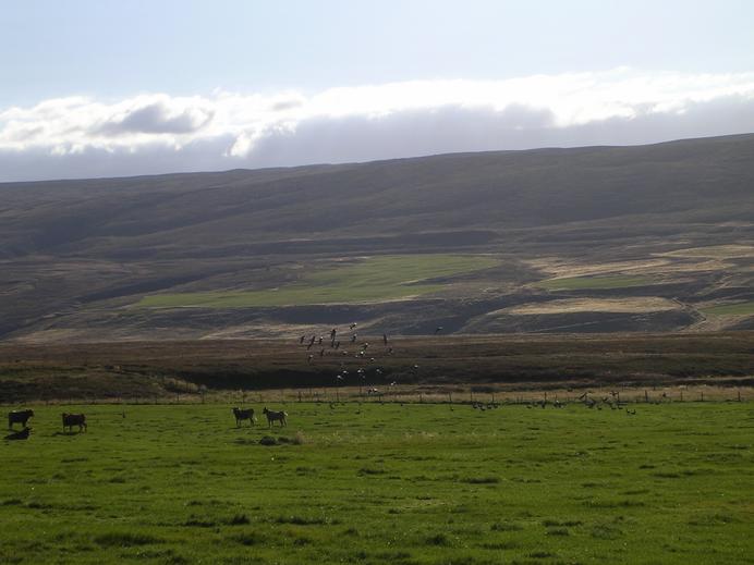 Horses and ready-to-leave geese in autumn in Fnjóskadalur