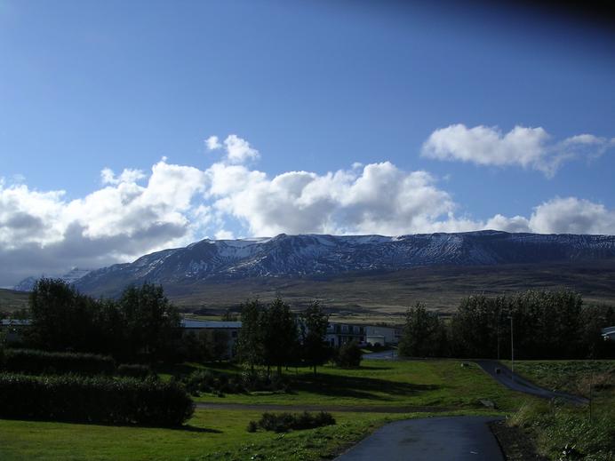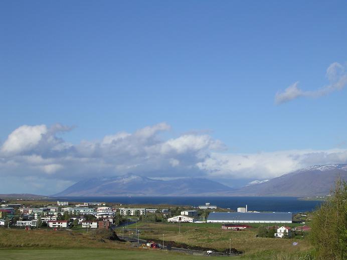 View from the Kotárborgir over Akureyri and Eyjafjörður on a sunny day