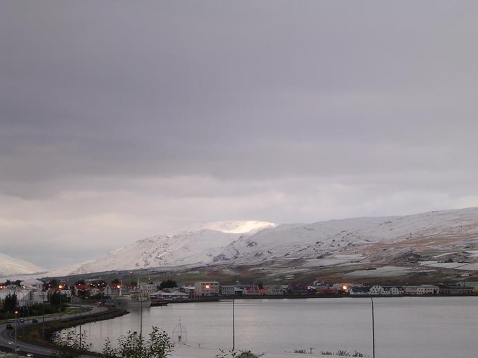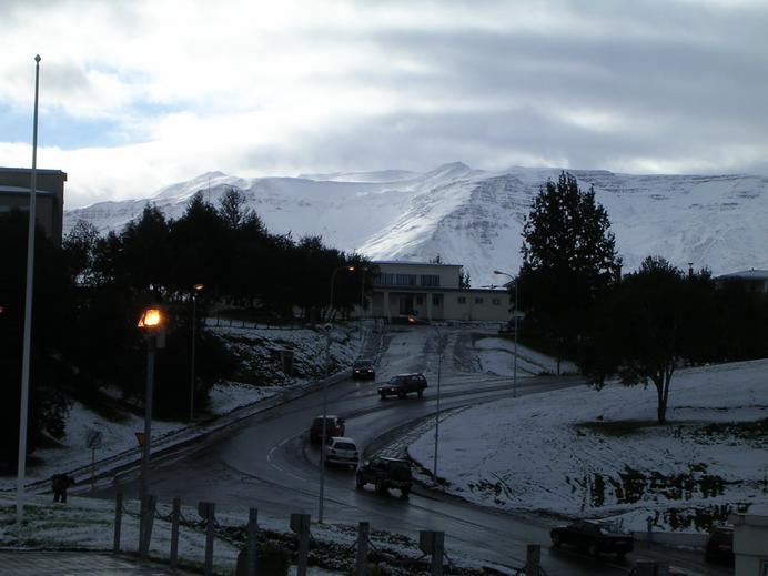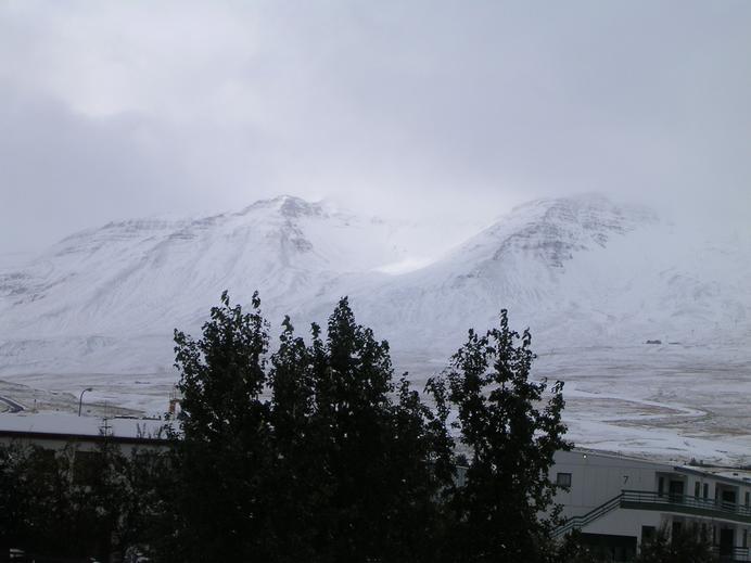 Snow on the hillsides of Eyjafjörður north of Akureyri