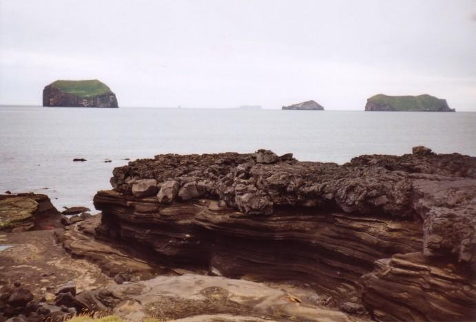 Eine Lavaschicht im südlichen Heimaey, dahinter Suðurey und Álsey
