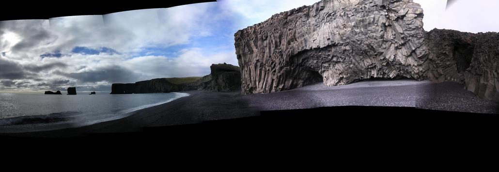Der schwarze Strand unterhalb Kap Dyrhólaey mit den Basaltformationen.