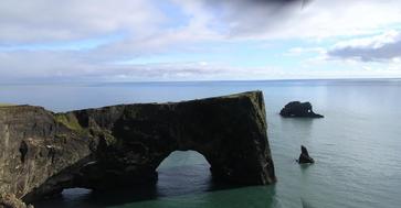Der Bogen von Kap Dyrhólaey, südlichster Punkt Islands.Der Bogen von Kap Dyrhólaey und Felsen im Meer rundherum.