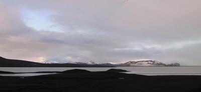 Der Stausee Hrauneyjarlón mit schneeweissen Bergen und Hekla dahinter.