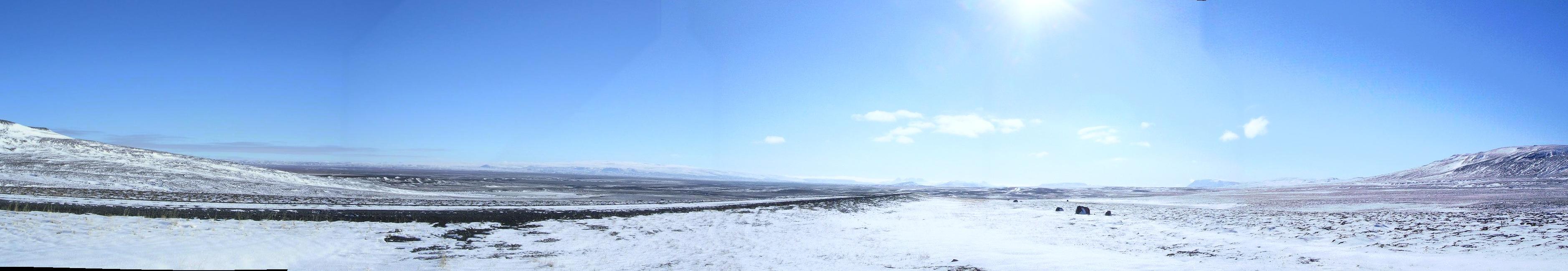 The Kjölur highlands, between Hofsjökull and Langjökull, as seen from the emergency hut Arnarbæli.View from the hut Arnarbæli over the snowy Kjölur highland.