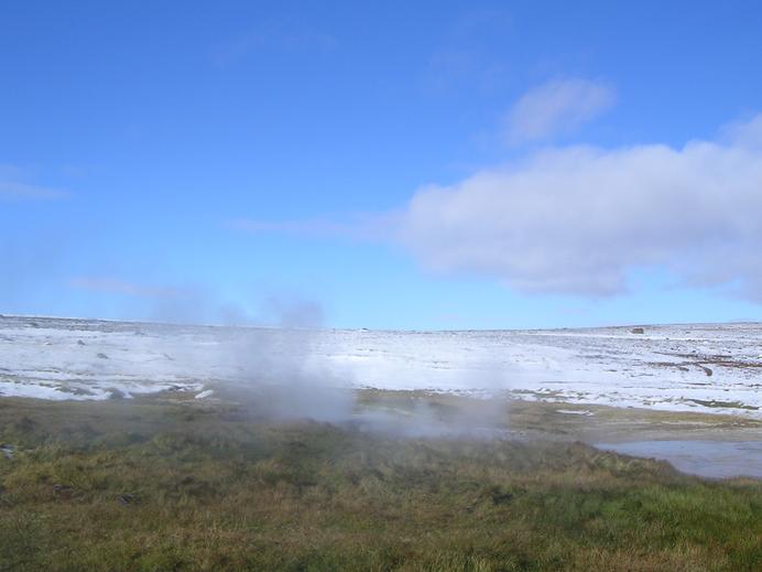 Schnee, Dampf, grünes Gras und bestes Wetter in Hveravellir