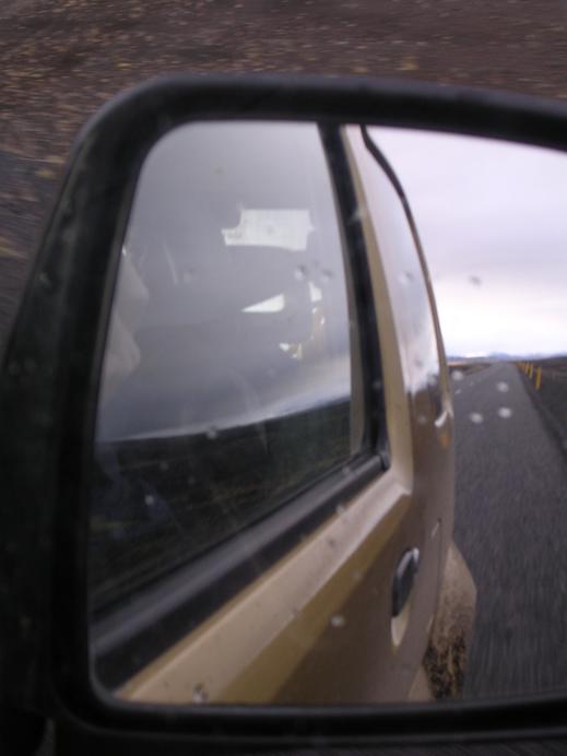 Blick in den Rückspiegel auf die fast schnurgerade Straße 26