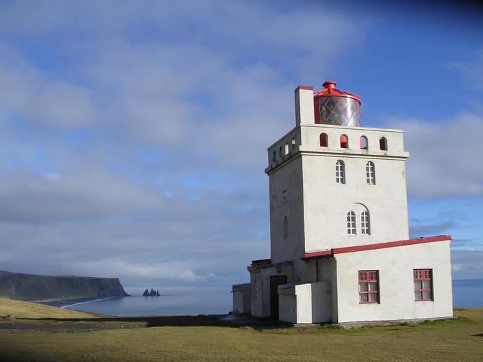 Der Leuchtturm von Dyrhólaey mit den Reynisdrangar im Hintergrund