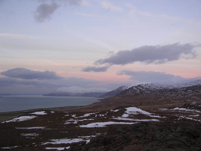 Blick auf den Kaldbakur mit einem typischen Winterhimmel darüber