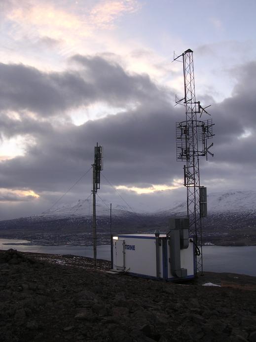 Funkstation auf der Vaðlaheiði mit Akureyri im Hintergrund