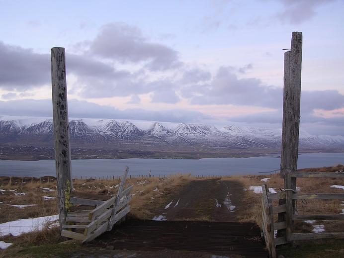 Schafsgatter, Tor und Wegweiser an einer Piste über die Vaðlaheiði