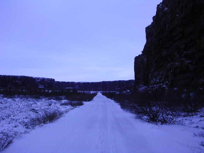 Schnee auf der Straße entlang der Felsinsel Eyjan