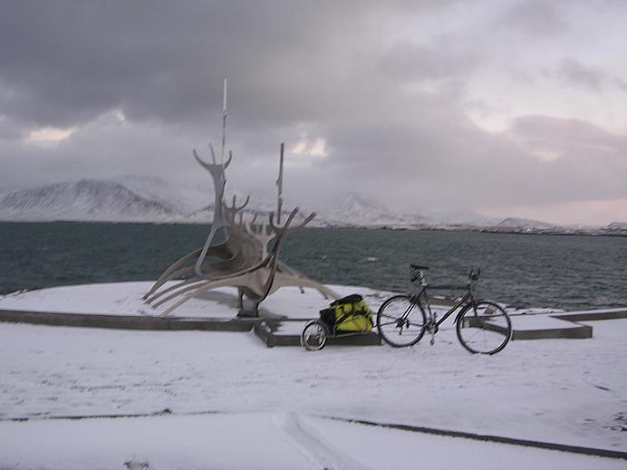 My bike at the memorial Sólfari, in December