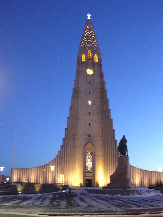 The lightened Hallgrímskirkja in Reykjavík
