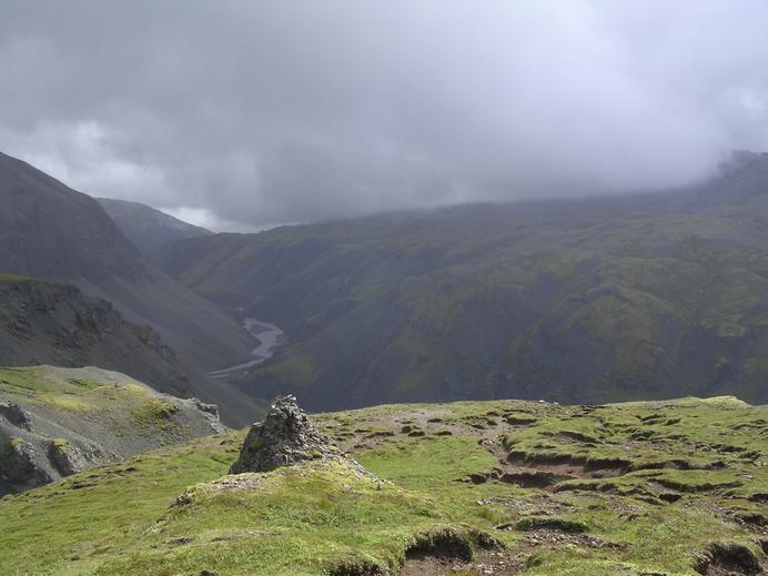 Der grüne Flecken Stórihnaus vor der Schlucht der Jökulsá í Lóni