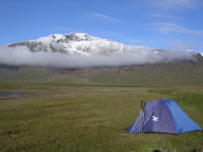 Mein Zelt an der Hafursá mit strahlend blauem Himmel überm frisch verschneiten Snæfell