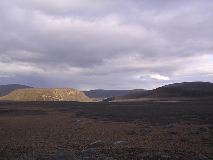 Schwacher Regenbogen und warmes Abendlicht an der Jökulsá á fjöllum