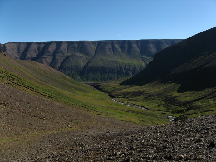 View across Skarðsárdalur down into Bleiksmýrardalur