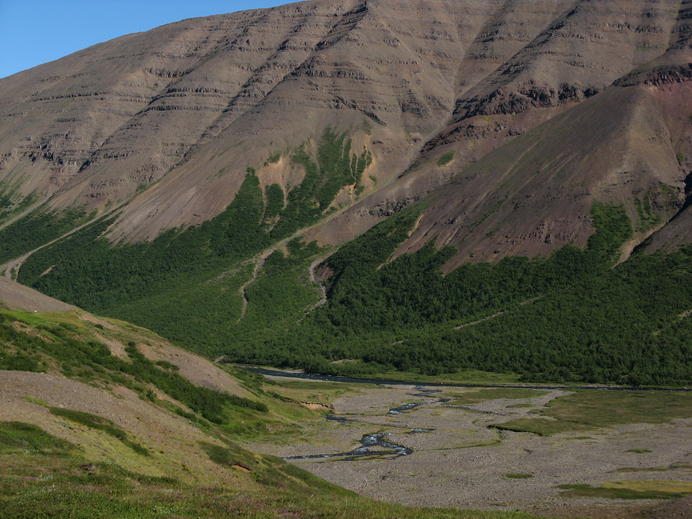 View out of Skarðsárdalur onto the woods of Bleiksmýrardalur