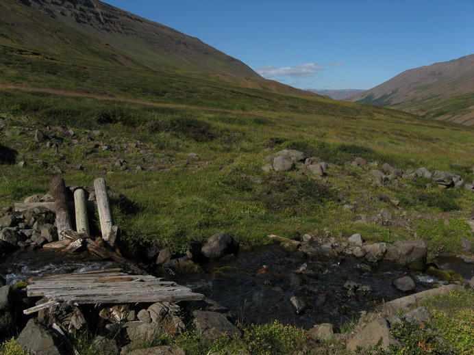 The broken hikers bridge in Bleiksmýrardalur