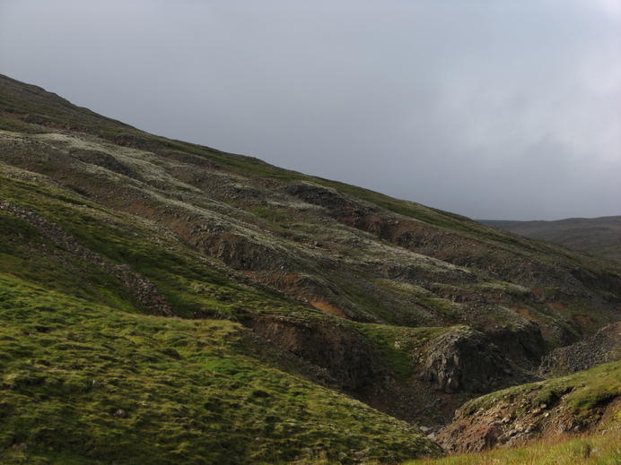 Etwas zerklüftete Landschaft auf der Westseite des Seljadalur