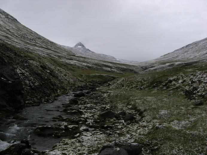 View onto the pointy Suðurárdalshnjúkur and the pass over to Seljadalur