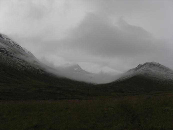 Fog and snow up at Hjaltadalsjeiði