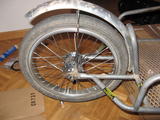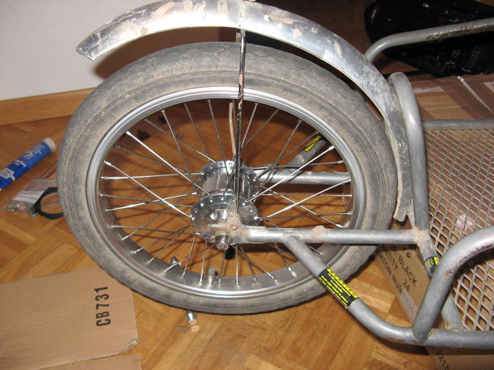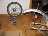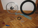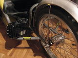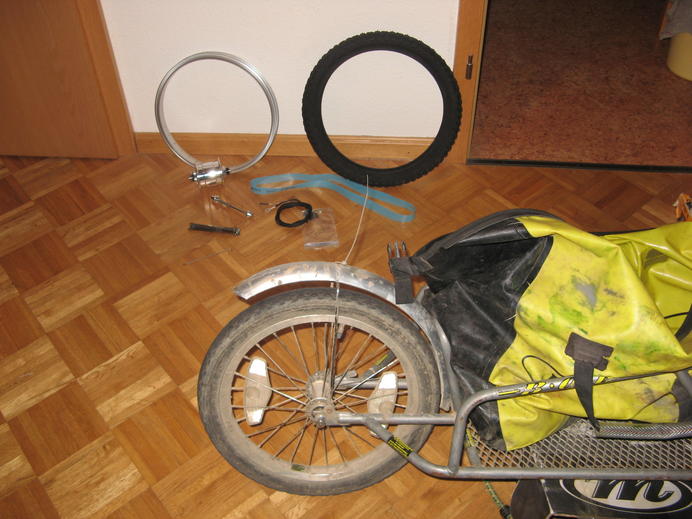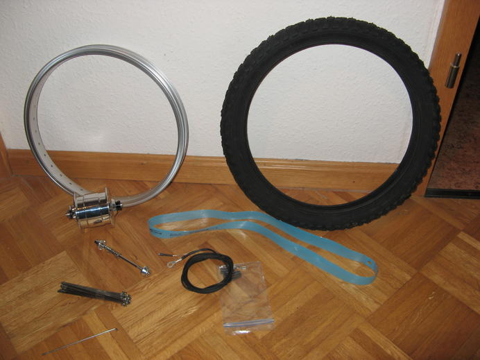 Rad und Dynamo Als Generator fürs Fahrrad bieten sich Nabendynamos an. Hohe Energieausbeute und keine (?) Probleme mit der Wartung, beste Voraussetzungen also. Fragt sich nur noch, wo man so einen Nabendynamo einbaut. Da ich auf Reisen eigentlich immer ein drittes Rad im Gepäckanhänger habe, ist das wohl für mich die richtige Stelle: ganz hinten im 16" Rad. Zum einen brauche ich den Dynamo nur auf Reisen, also wenn ich auch den Anhänger dabei habe. Zum anderen dreht sich ein Nabendynamo im 16" Rad erheblich schneller und erzeugt dementsprechend mehr Energie. Wenn ich also mit dem Anhänger-Dynamo mit 10km/h über Schotterpisten holpere, kommt immer noch so viel Leistung raus, als würde ich mit meinem 26" Vorderrad 16km/h fahren. Schaffe ich mal auf ner Asphaltstraße 24km/h, dann entspricht das der Leistung von 39km/h im großen Rad. Die benötigten Felgen und vor allem die typischen Speichenlängen für 16" Räder sind allerdings nicht ganz so einfach zu beschaffen. Incl. einem SON-Nabendynamo gibt es aber zum Glück alles beim Online-Laden Pedalkraft, so dass ich zwei Wochen nach der ersten Anfrage das Paket bei der Post abholen konnte. Die konkrete Bauteilliste: SON 28 (36loch), Schürmann Tiefbettfelge 305 (25mm breit, 36loch), Speichen (1x gekreuzt, 118mm oder so). Ich hatte ja erst überlegt, eine Hohlkammerfelge zu nehmen und radial einzuspeichen, aber das wäre von den Lochzahlen her alles komplizierter geworden und außerdem soll man den SON 28 besser nicht radial einspeichen. Dann hatte ich endlich wiedermal Gelegenheit, ein Laufrad einzuspeichen. Mit improvisiertem 16" Zentrierständer war das ein Kinderspiel und das neue Laufrad im Nu fertig. Aber es ist das letzte 16" Rad, das ich gekreuzt einspeiche. Besser ists, wenn sich alle Speichenköpfe auf der Außenseite der Nabenflasch befinden, was nur bei radialer Einspeichung möglich ist. | |