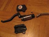 Zweites wichtiges Teilstück: der Bremshebel. Der passt an "normale" MTB-Lenker mit ichweißnichtwelchem Standarddurchmesser, wo eigentlich alles dranpasst. Die Befestigung ist allerdings modular an den eigentlichen Bremshebel drangeschraubt, andere Schellenduchrmesser kann man vielleicht auch einsetzen, ohne gleich den ganzen Hebel wechseln zu müssen. Abgesehen davon, dass alles seitenverkehrt ist, unterscheiden sich linker und rechter Hebel nicht. Und diese Unterschiede beziehen sich auch nur auf das Metallgehäuse, wähend Zylinder, Bremsgriff und alles andere gleich ist. Also einfach dranschrauben und losfahren.