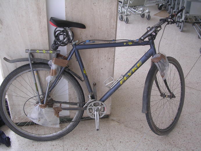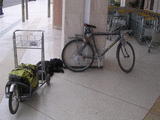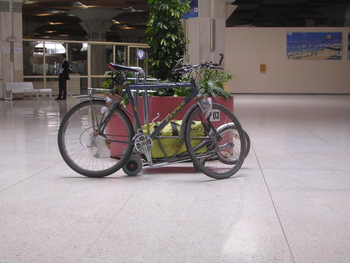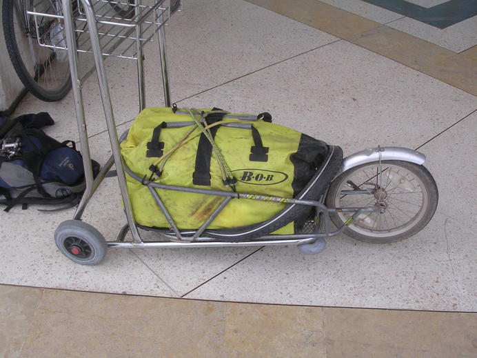 Unterwegs mit dem BOB Yak In der Handhabung ist der Hänger etwas umständlich, aber das sind wohl alle Gepäckstücke. Man muß ihn fast zwangsläufig mit zwei Händen führen, wenn man ihn mal ohne Rad bewegen will, ansonsten kippt er immer zu einer Seite. Er hat ja nur einen festen Standpunkt mit seinem einen Rad. Wenn man ihn am Fahrrad hat und zuviel hinten draufgepackt hat, merkt man auch deutlich, dass das Gespann eine leicht erhöhte Tendenz zum Umfallen hat. Hier hilft es, sein Gepäck so zu beschränken, dass nicht viel über die oberen Rahmenstangen des Yak hinausschaut. Somit liegt der Schwerpunkt tiefer, und die ganze Handhabung wird einfacher. Bewährt hat es sich für mich, die mitgelieferte Tasche gut zu füllen und oben drauf je nach Bedarf einen kleinen Tagesrucksack zu spannen. Wenn man dann an einer kritischen Stelle schieben muss, einfach den Rucksack schultern und es geht weiter. Andererseits kann man auch leicht mal ein paar Einkaufstüten mit Vorräten für die nächsten beiden Wochen oben drauf spannen. Solange man fahrenderweise unterwegs ist, merkt man kaum etwas von all dem Gepäck. Oft ist man bei An- und Abreise auf öffentliche Verkehrsmittel, Flugzeuge o.ä. angewiesen. Auch das geht ganz gut mit dem Yak. Meistens. Ein besonderes Hindernis sind Treppen, z.B. zum Bahnsteig rauf oder runter. Meist passt man mit dem langen Gespann auch nicht in Aufzüge rein. Ich fahre daher leidenschaftlich gerne Rolltreppen. Einfach draufrollen, gut festhalten und dann wieder runterrollen. Wenn es all diesen Luxus nicht gibt, hilft nur Auseinandernehmen und Treppensteigen in drei Zügen (einmal rauf, einmal runter, einmal rauf). Auch beim Ein- und Aussteigen in Züge führt wohl am Schleppen kein Weg vorbei. Oft findet man aber hilfsbereite Menschen, die einem irgendetwas abnehmen oder wenigstens Platz machen, dass man genug Zeit zum Ein- und Aussteigen hat. Sobald alles im Zug ist, stelle ich den Hänger meistens gleich neben das Fahrrad, nehme meinen Tagesgepäckrucksack ab und die Sache ist erledigt. Angeblich kostet bei der DB ein Ahnänger nochmal so viel wie ein Fahrrad alleine, aber die genaue Regelung ist den meisten Kontrolleuren genausowenig bekannt wie mir... Schließlich das Fliegen mit dem BOB Yak. Viele geben ja schon ihr Rad nicht gerne in fremde Hände, und was macht man dann erst mit einem Hänger? Im Allgemeinen verwende ich hierbei die Praxis, dass Flughafenangestellte sehr viel sorgsamer mit Sachen umgehen, die sie sehen und erkennen können, als einfach mit großen, schweren Schachteln. Nach mehreren Experimenten bin ich mittlerweile zum folgenden Vorgehen gekommen. Alle kleineren Sachen werden mit in den großen gelben Sack gesteckt und der wird fest zugemacht. Die Gabel wird vom Anhänger abmontiert, der Pivot-Bolt wieder eingesetzt und festgeschraubt. Somit ist der Hänger fertig, das ist mein "Gepäckstück". Bleibt noch das Fahrrad und die Anhängergabel. Die Gabel mach ich am BOB Schnellspanner fest, klappe sie ganz nach oben und klebe sie am Rahmen fest. Das geht natürlich besonders gut, wenn man keinen Gepäckträger dran hat. Noch ein bisschen Folie um die wichtigsten Stellen geklebt, und fertig ist das Rad. | |