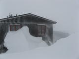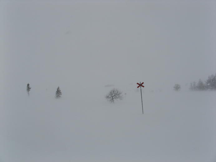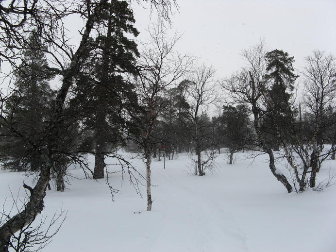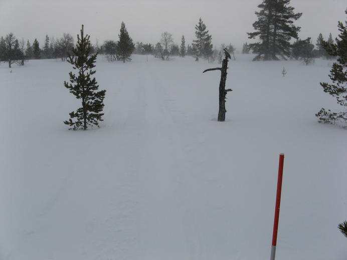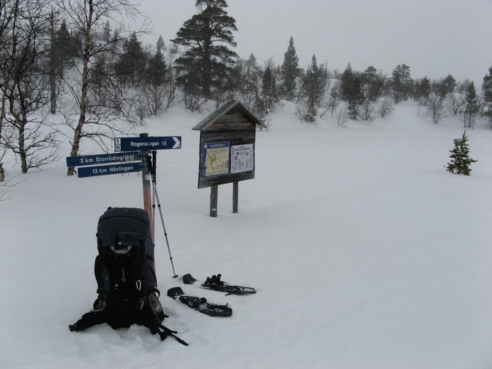 Schließlich überquerte ich irgendeine lokale Grenzlinie, die zugleich Grenze zwischen Rogens und Långfjällets naturreservat war, und außerdem in etwa mit der Baumgrenze übereinstimmte. Ab hier gab es mächtigen Wind mit Schneetreiben von vorne, und die Spur war schon so tief zugeweht, dass ich endlich mal wieder froh über meine Schneeschuhe war. In einem halben white-out erreichte ich schließlich die Hütte, mit GPS und Wegmarkierungen überhaupt kein Problem. Auch diese Hütte gehörte zum STF und hatte natürlich einen Warden und Supermarkt-Schrank.