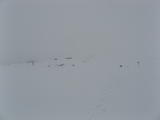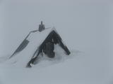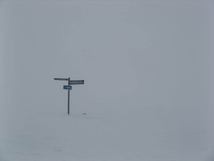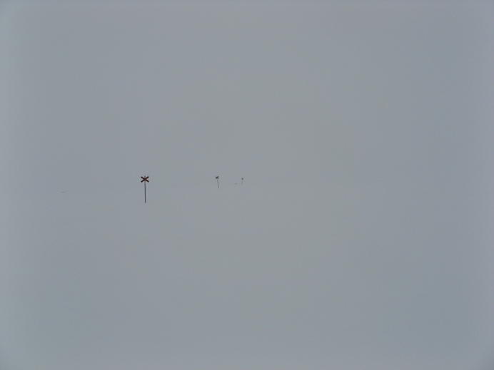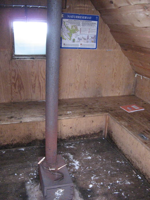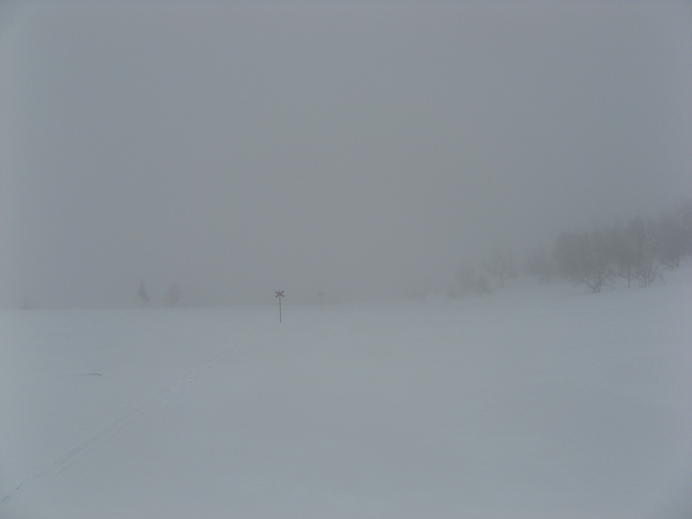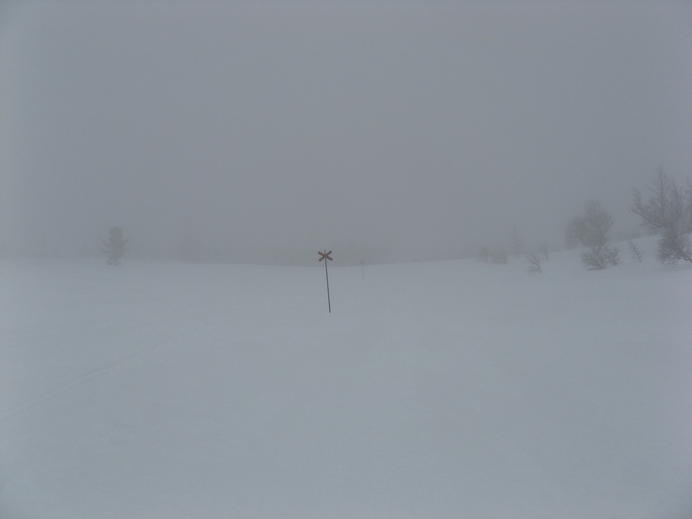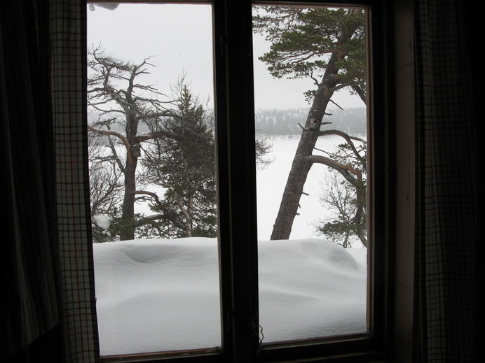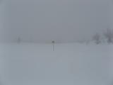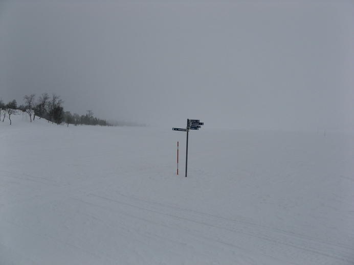 Aufbruch war also in einem white-out, aber auf den gut markierten schwedischen Skiloipen konnte man immer noch von einer Markierung zur nächsten schauen. So war es kein Problem, die Nothütte am Slagusjön zu erreichen, die als kleines, dreieckiges Hexenhäuschen aus dem Schnee schaute. Von dort an ging es bergab und wurde langsam auch wieder waldiger.