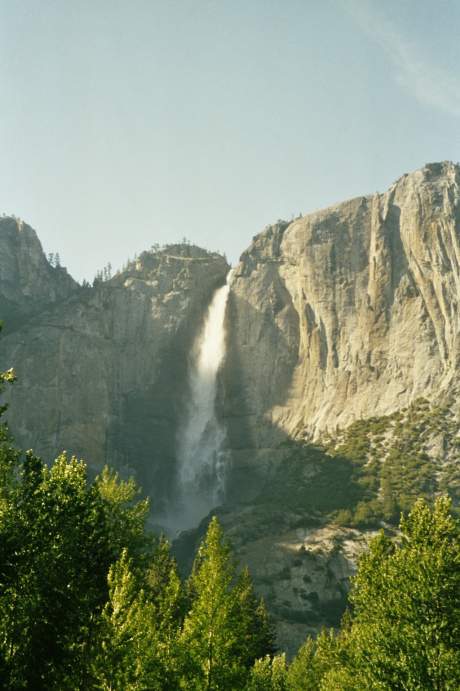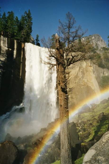 Postkartenansicht des Vernal Fall mit Regenbogen und allem